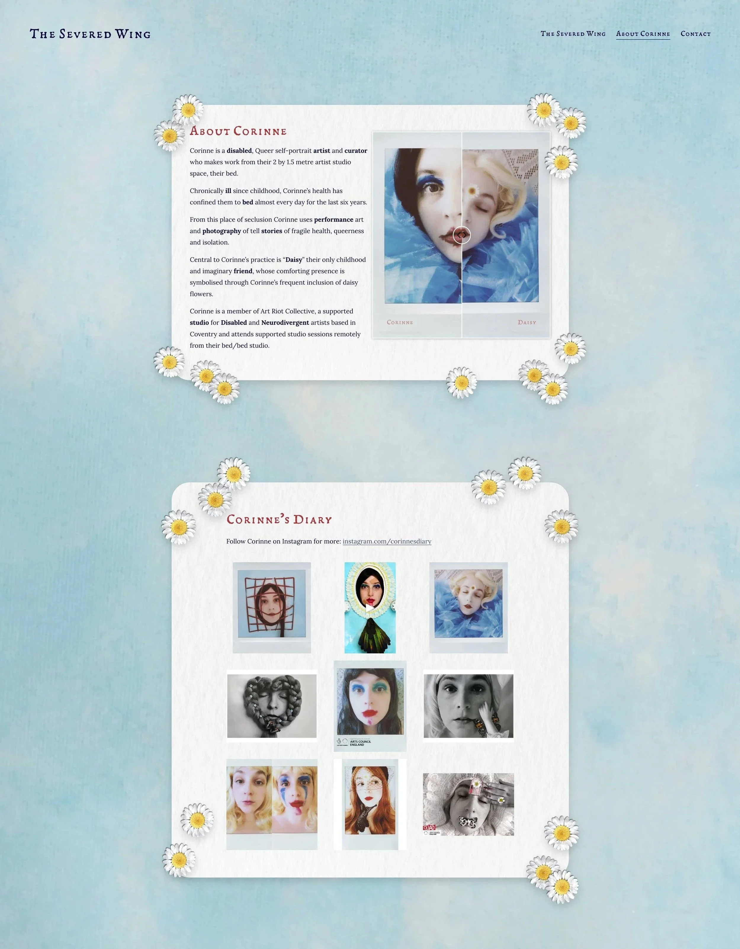 The design draws directly from the materials and imagery of Corinne’s work, incorporating pressed daisies and a soft sky background to create a visual language that feels tactile and atmospheric. The structure balances delicacy with clarity, using restrained typography and accessible navigation to ensure the site remains inclusive and easy to use.